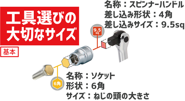 ソケットは、ネジの頭の形状とサイズに合わせ、さらに、差し込み角が、スピンナーハンドルと同じサイズを選びます。